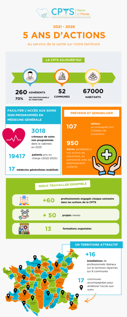 Depuis sa création, la CPTS s’engage aux côtés des professionnels de santé et des partenaires du territoire pour améliorer l’accès aux soins, renforcer la coordination entre acteurs et développer des actions de prévention au plus près de la population.
