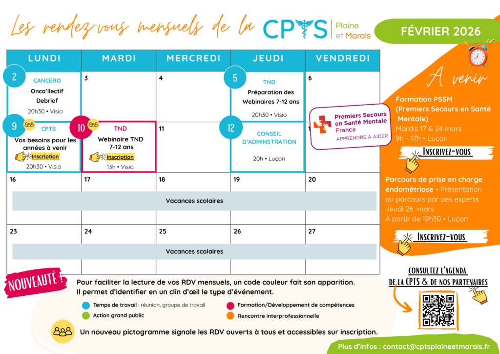 Rendez-vous de la CPTS – Février 2026 Publication publiée :22 janvier 2026 Post category:Actualités adhérents / Actualités tout public / RDV de la CPTS Je consulte l'agenda complet et je m'inscris aux actions Vous devriez également aimer Movember : un mois pour parler santé masculine 6 novembre 2025 Dry January : prêts à relever le défi ? 4 janvier 2025 SPORT SANTÉ, ACTIVITÉ PHYSIQUE ADAPTÉE.. QU’EST-CE QUE C’EST ET À QUI CELA S’ADRESSE-T-IL ? 27 septembre 2022